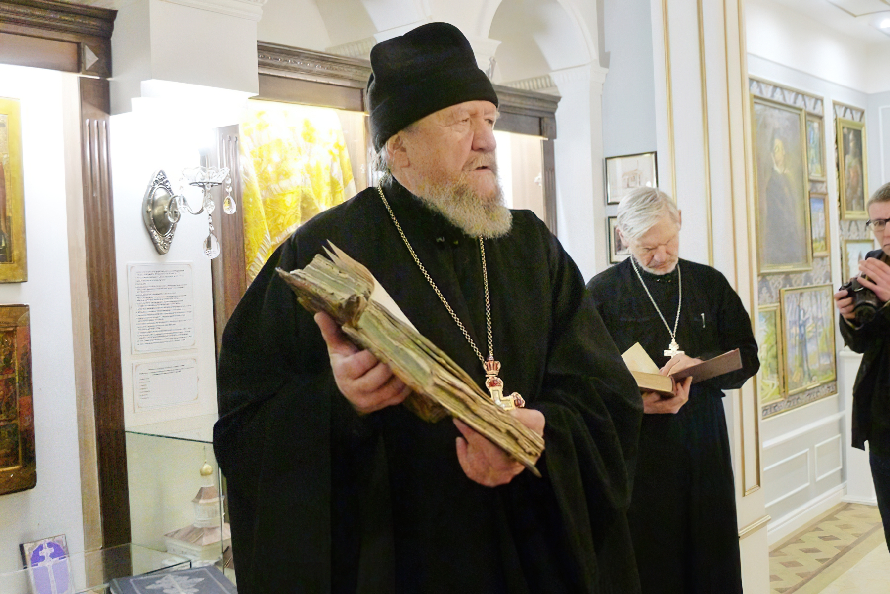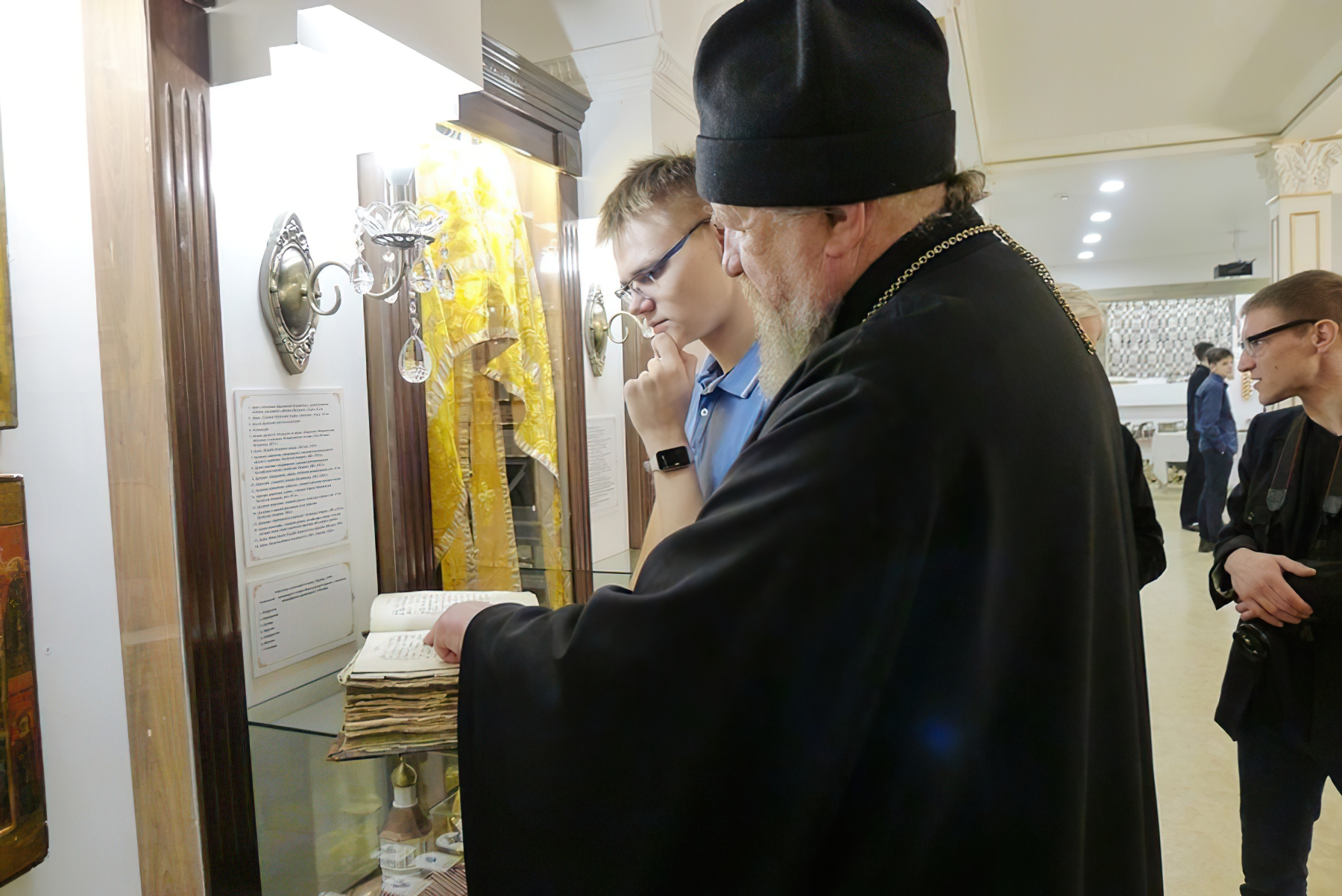 Ученики внимательно рассматривали книги и пытались прочитать текст на церковно-славянском языке.