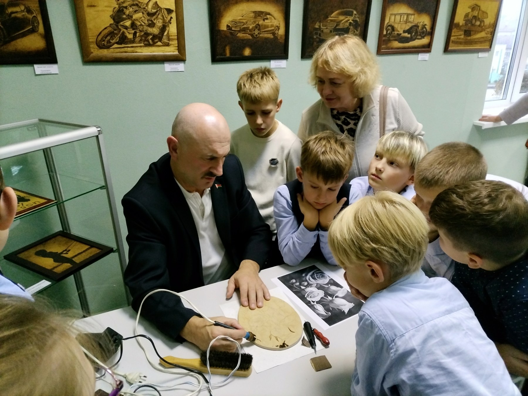 Первыми посетителями вернисажа стали не только взрослые логойчане, но и дети. Ребята с большим интересом знакомились с работами художника и с не меньшим вниманием слушали его историю: как пришел к рисованию огнем по дереву. — Я рос без родительской любви и ласки, воспитывался в школе-интернате. Уже через сто метров за проходной этой школы приходилось часто стоять за себя. В детстве очень любил рисовать графику простым карандашом, это вылилось в мое сегодняшнее творчество. Я был трудным подростком, и спорт, и любовь к рисованию спасли меня от печальных последствий. Сегодня работаю тренером по самбо и дзюдо. Вот вчера в аэропорту встречал воспитанницу, которая стала призером чемпионата мира в Бишкеке. Моя основная работа довольна динамична и эмоциональна. Пирография является своеобразным антистрессом, который напоминает, что без труда, терпения и усилий ничего достичь невозможно, — рассказал гостям выставки Игорь Коперский.